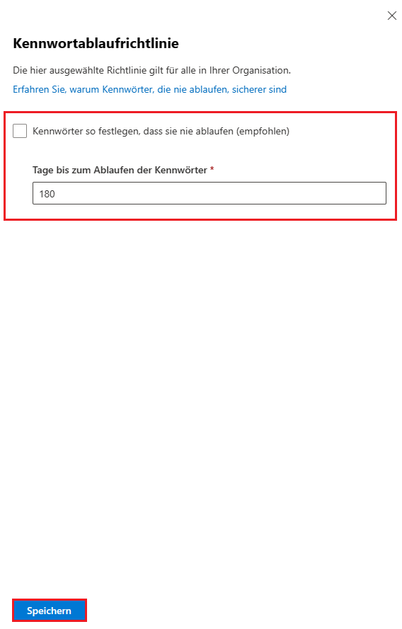 5. Das Fenster „Kennwortablaufrichtlinie“ erscheint. Hier können Sie entweder festlegen, dass die Kennwörter nie ablaufen oder nach wie vielen Tagen die Kennwörter geändert werden müssen. Klicken Sie auf „Speichern“