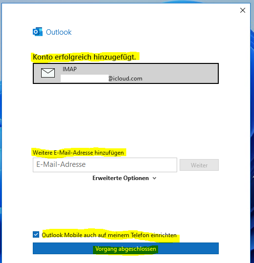 5. Das iCloud Mail Konto wurde erfolgreich hinzugefügt. Klicken Sie anschließend auf „Vorgang abgeschlossen“